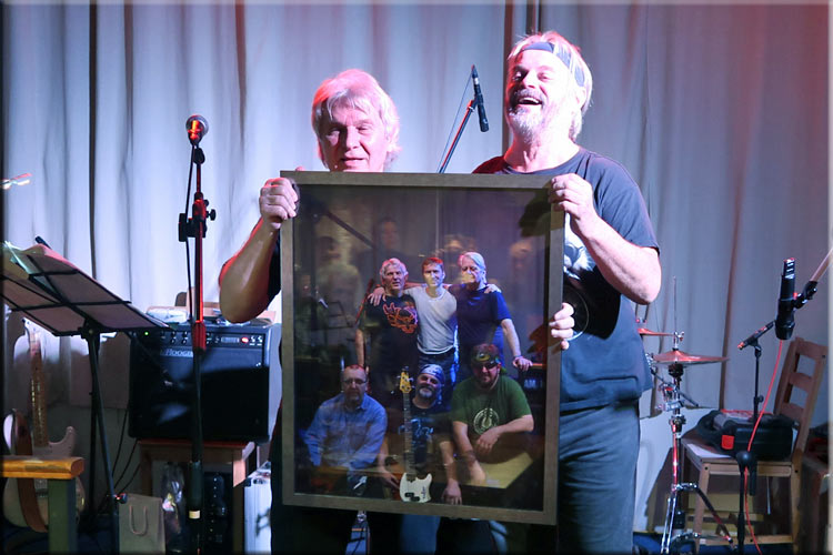 Toník Koubek byl očividně překvapen, pak dostal dárky od účinkujících i posluchačů. Kapela šlapala, lidé na sále se bavili.