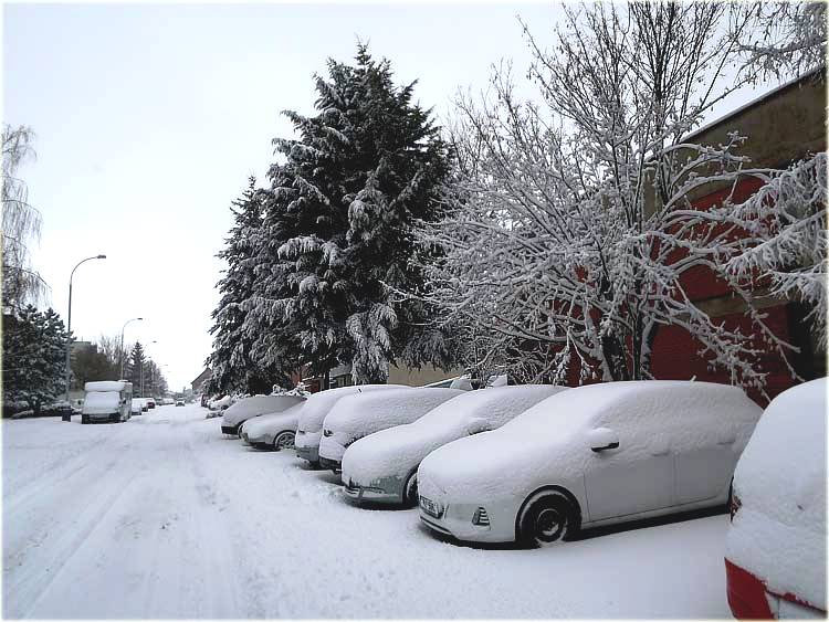 Zasypaná auta v ulici Navigátorů