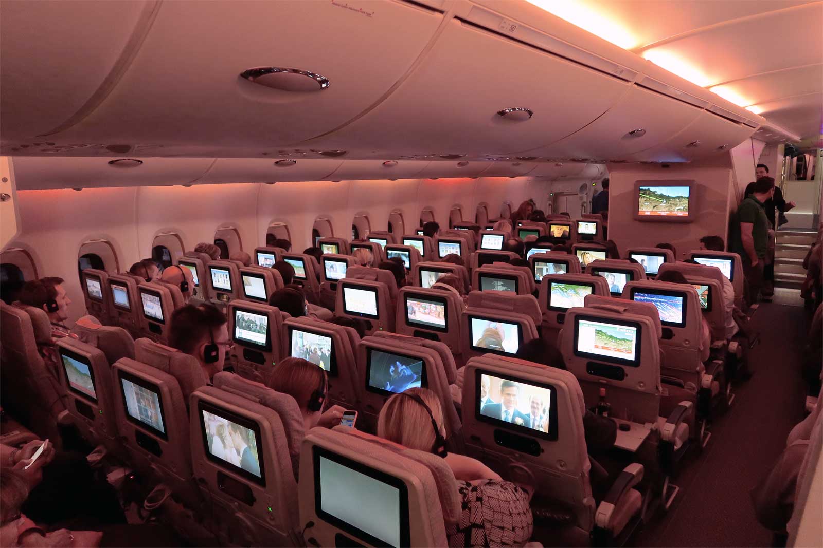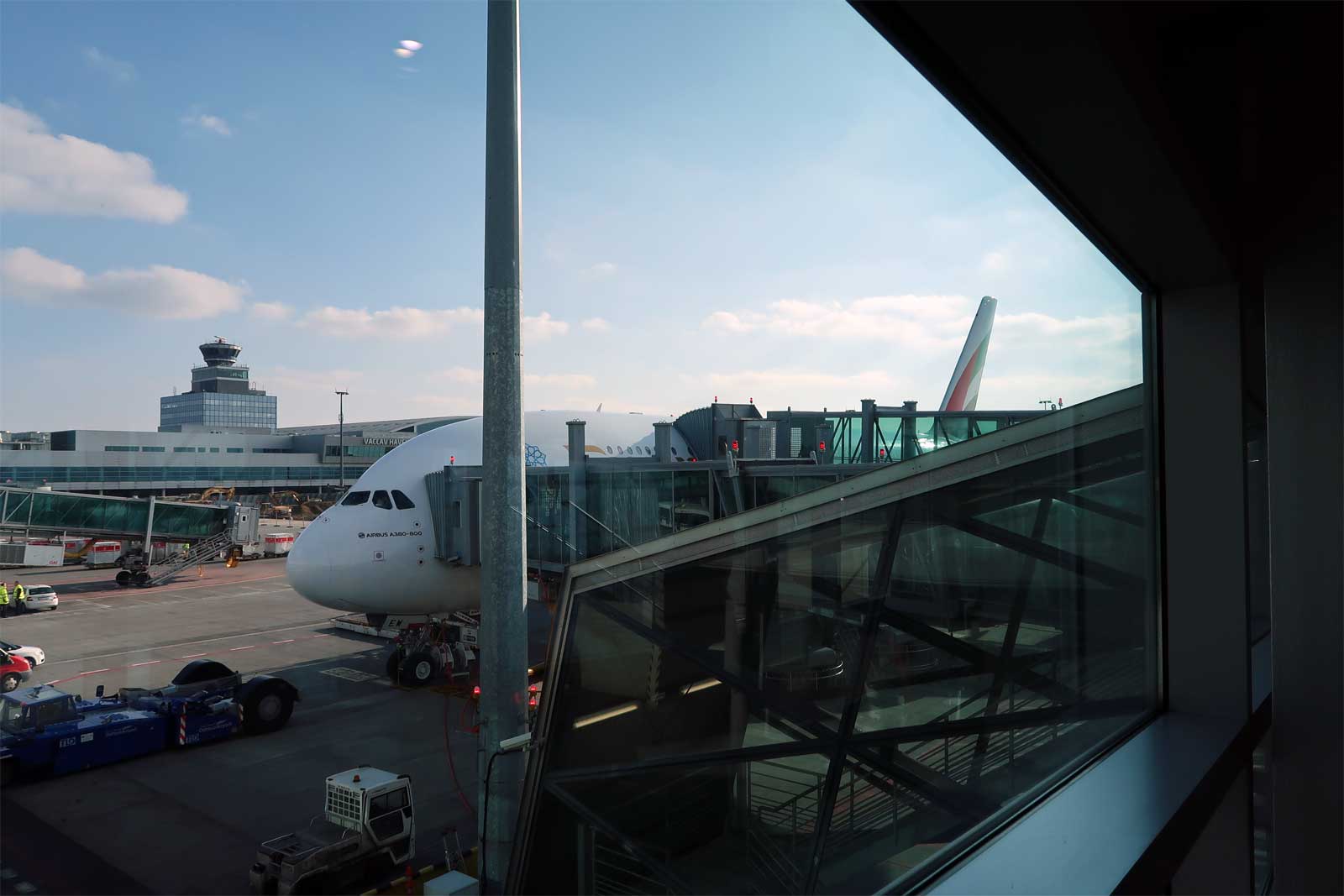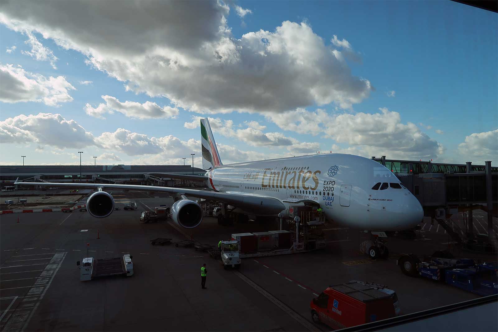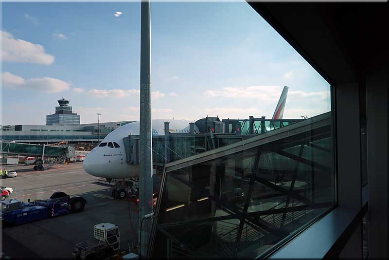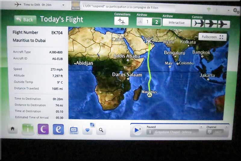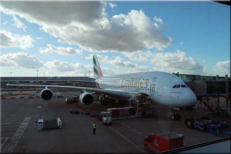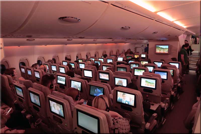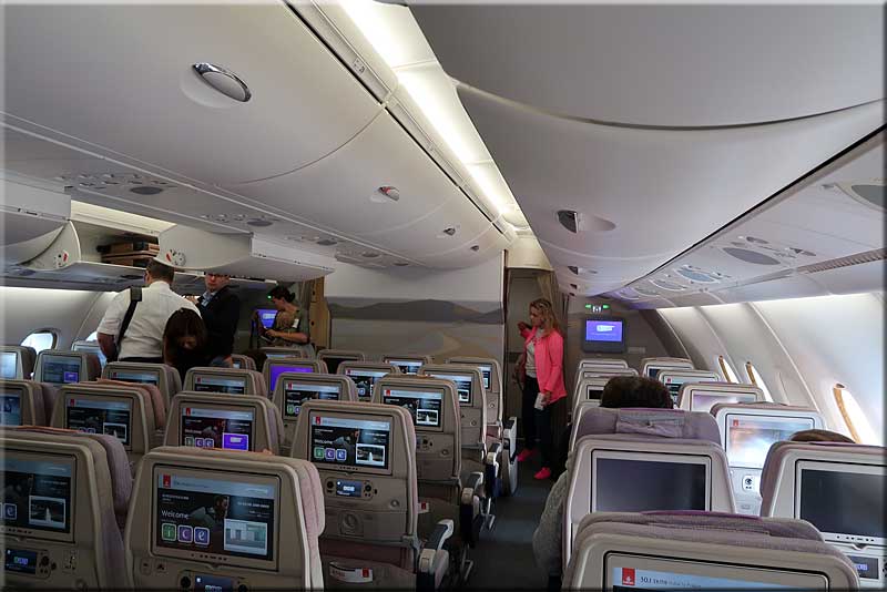 Z Prahy tedy letíme čtyřmotorovým dvoupodlažním Airbusem A380-800. Je to největší letadlo pro přepravu osob. Trasu za rájem jsme strávili shodně na spodní palubě. Z Prahy dosti vpředu, z Dubaje jsme byli umístěni za křídlo. Je to docela jedno. Éro je tiché, téměř nedrncá. Dá se říci, že sedačky v konfiguraci 3 - 4 - 3 jsou poměrně pohodlné. Na zadní straně opěradla je umístěn display cestovního počítače. Můžete zde sledovat trasu letu, pohledy z letadla živými kamerami. K dispozici je bezpočet filmů a hudebních desek, k poslechu máte k dispozici sluchátka.