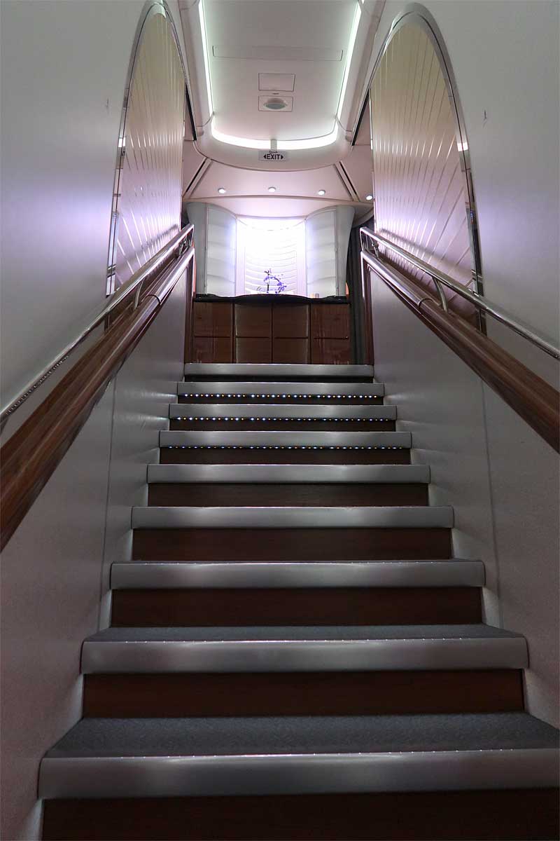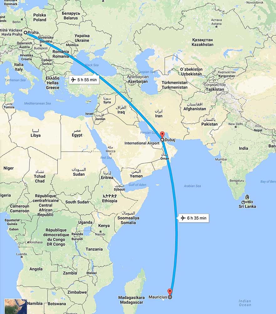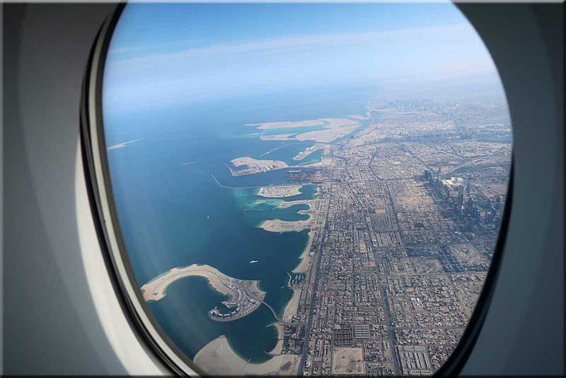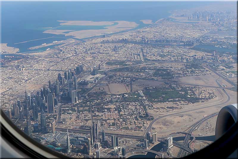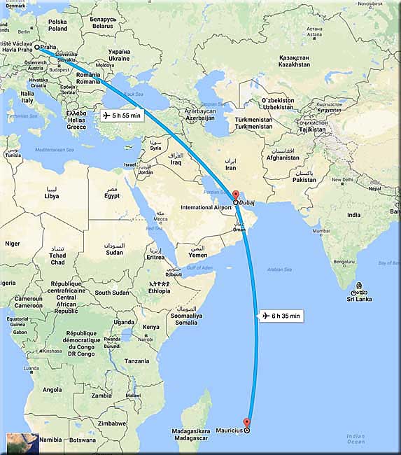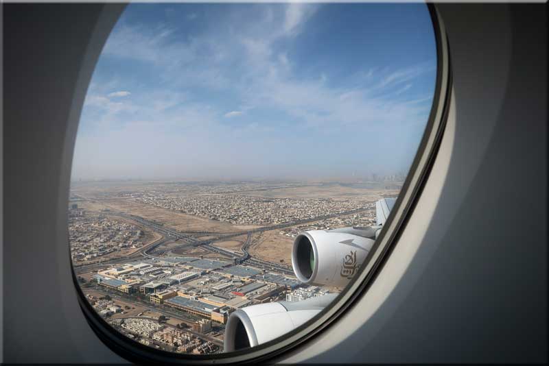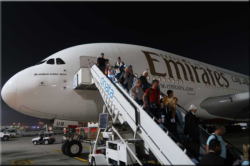 Tato cesta už tak radostná není. Dovolená je u konce. První část letu jsme byli opět na spodní palubě. Z Dubaje jsme pak letěli v horní části letadla (konfigurace sedadel 2 - 4 - 2) je příjemnější. Stravování je klasické. Spousta blbovin, že se na stoleček ani nevejdou. Překvapila nás česky a slovensky mluvící obsluha vč. českého kapitána.