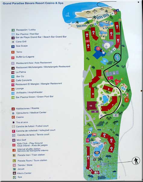 Mezi oběma částmi je jakási zalesněná bažina. Rozsáhlý komplex je tedy rozdělen na dva vzájemně propojené celky. Z modernější části hotelového komplexu lze k moři dojít pěšky po asfaltové silnici. Bažina však trošku zapáchá a cesta je dlouhá cca 1 kilometr. Nebo se můžeme svést turistickým vláčkem, která zajišťuje spojení mezi oběma částmi hotelu. Ve špičkách však vláček bývá dost přeplněný a tak nezbývá, než čekat na další.